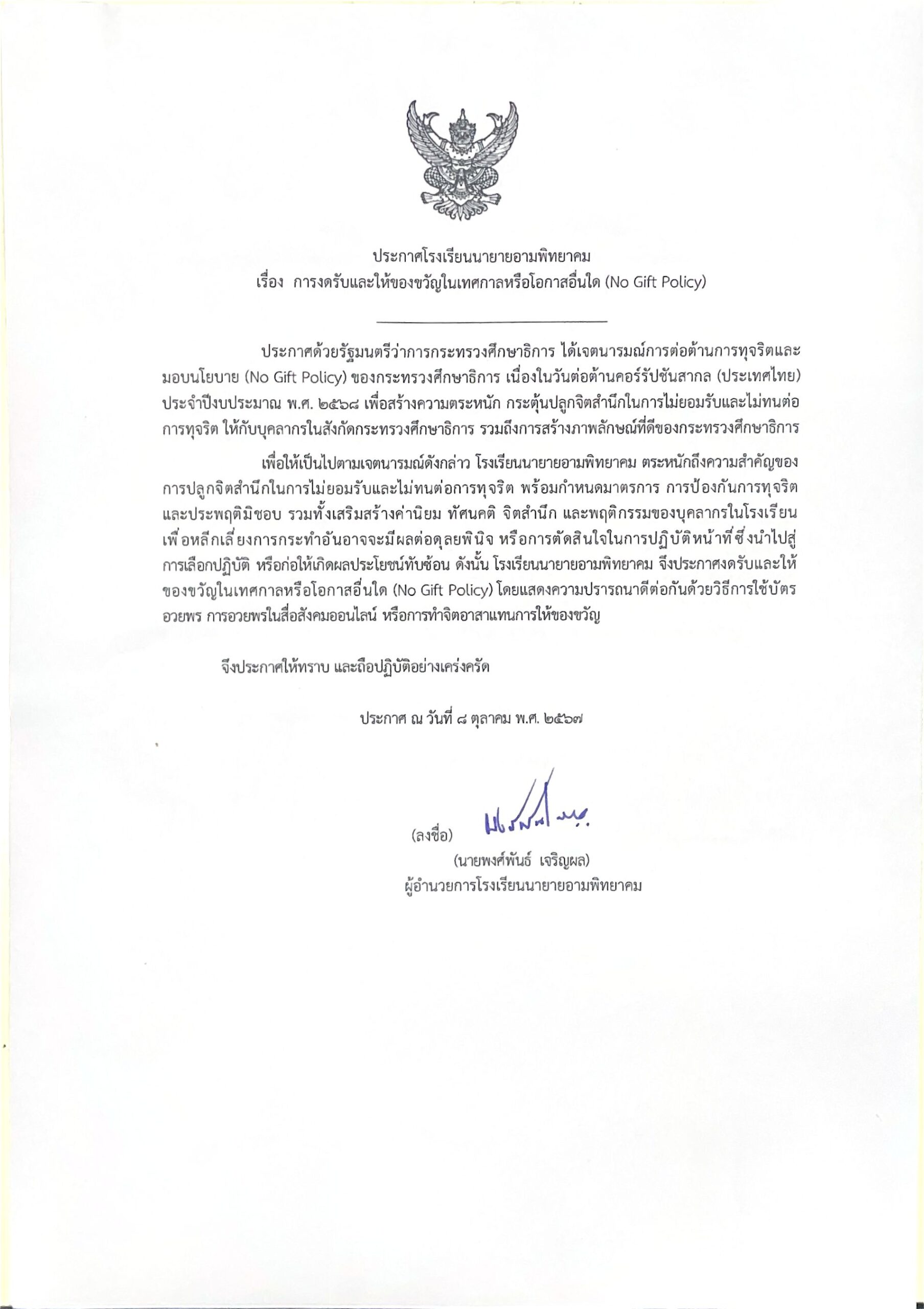 ประกาศเจตนารมณ์นโยบาย No Gift Policy จากการปฏิบัติหน้าที่ ปี 2567